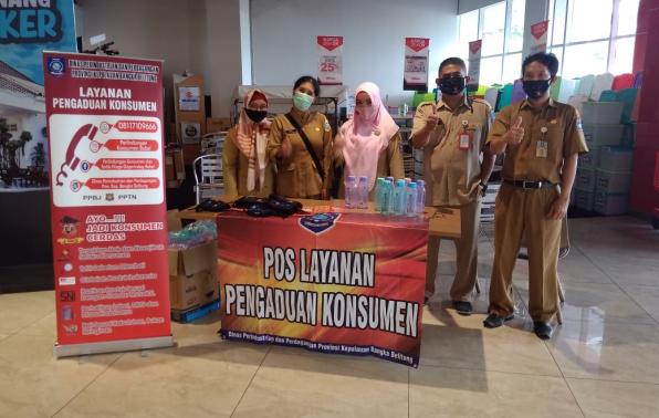 Pangkalpinang- Di masa pademi Covid -19, tidak menyurutkan niat Pemerintah Provinsi Kepulauan Bangka Belitung (Babel) melalui Dinas Perindustrian dan Perdagangan Provinsi Kepulauan Bangka Belitung, membuka pelaksanaan pos layanan pengaduan konsumen, sekaligus membagikan botol minuman dan masker di pusat perbelanjaan modern transmart Pangkalpinang.