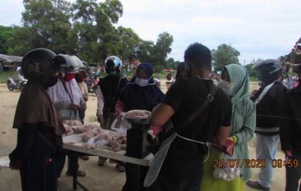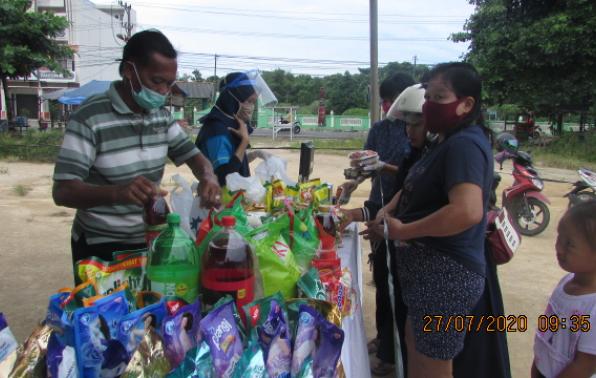 Dalam operasi pasar murah, Desperidag Provinsi Babel juga memperhatikan protokol kesehatan yaitu jaga jarak dan membagikan masker untuk pengunjung pasar murah. (Mislam)