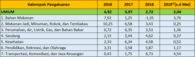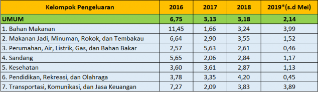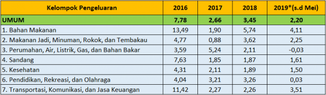 • Tingkat inflasi tahun kalender (Januari–Mei) 2019 sebesar 2,20 persen dan tingkat inflasi tahun ke tahun (Mei 2019 terhadap Mei 2018) sebesar 4,97 persen.